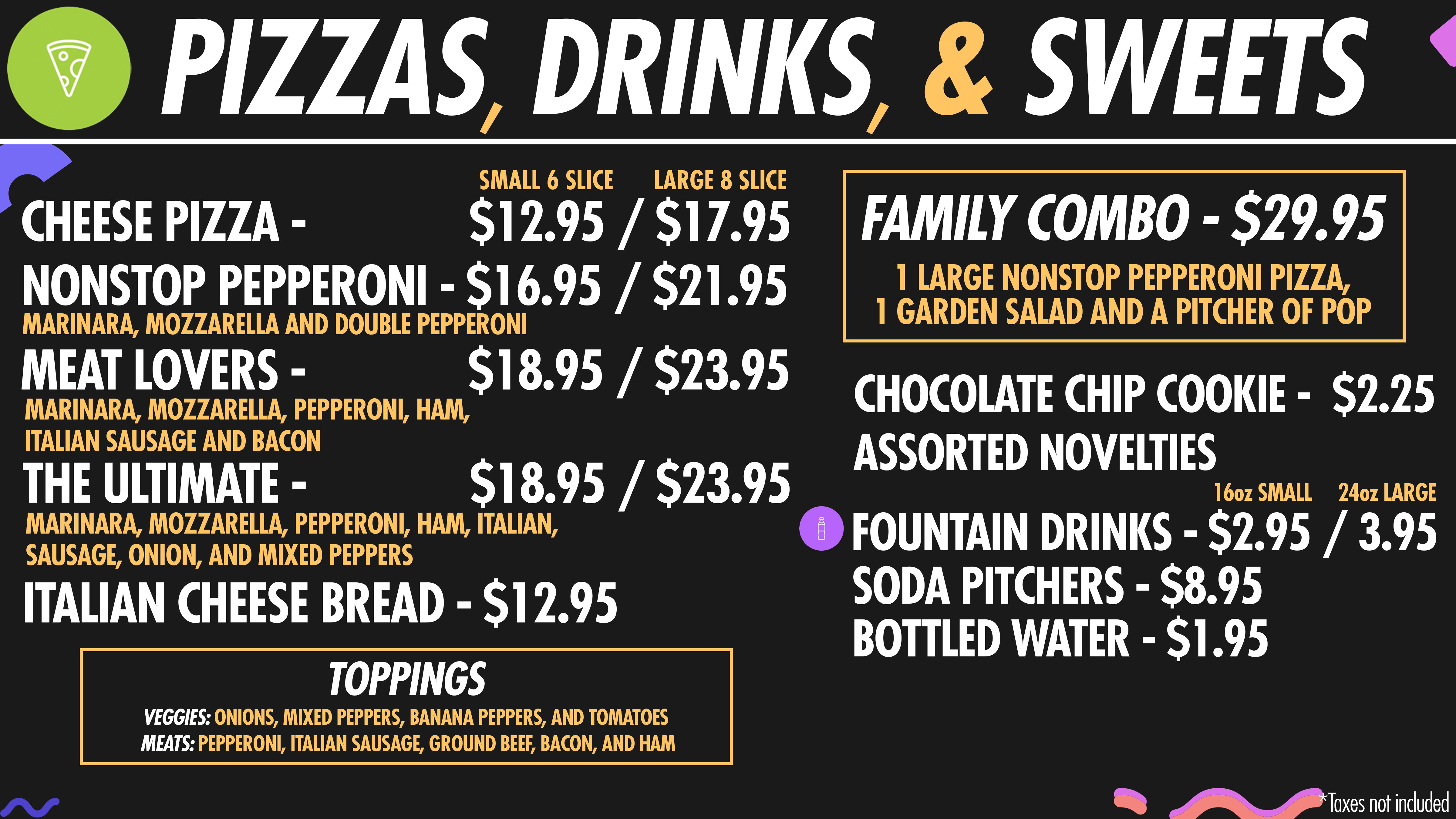 PIZZAS DRINKS & SWEETS NEW