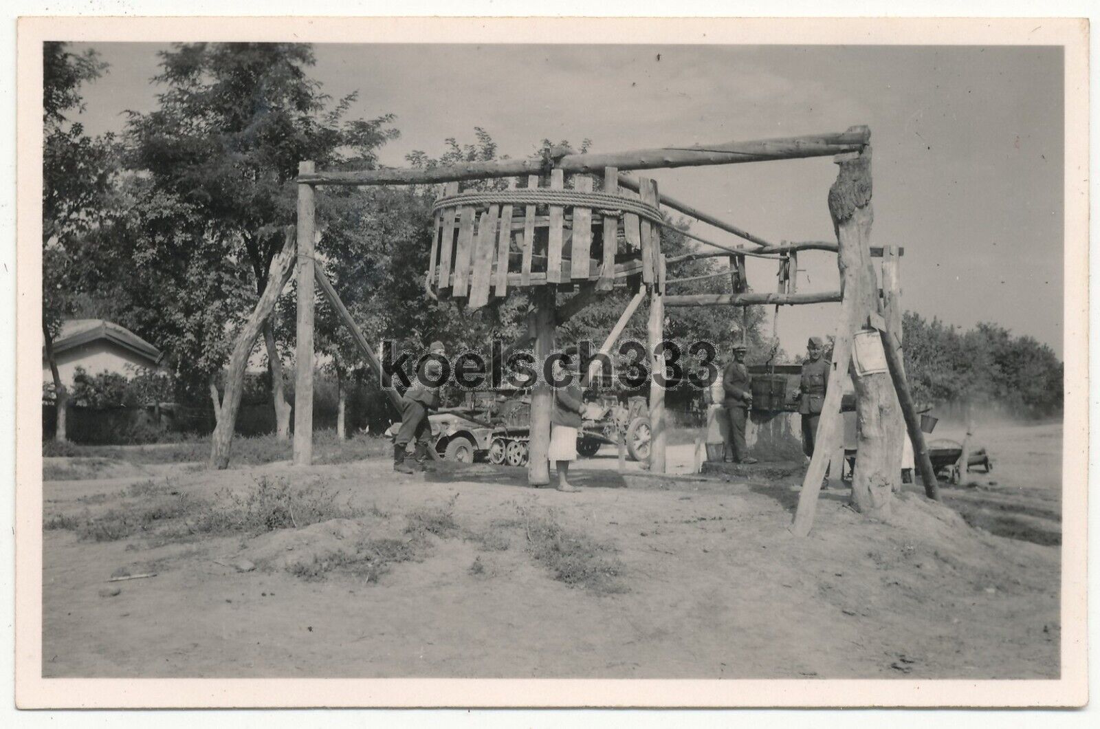 Foto Panzer Halbkette der Wehrmacht hinter einer Brunnen Mühle im Osten