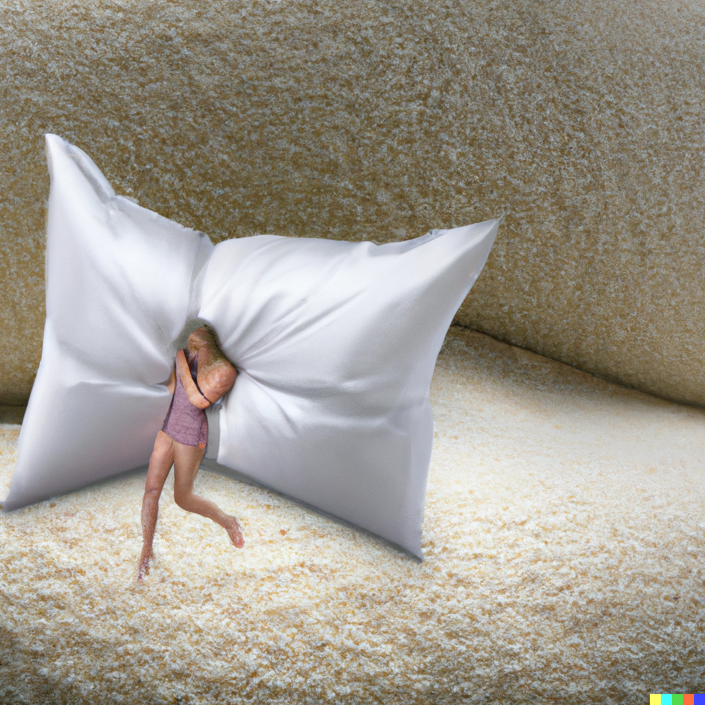 DALL·E 2022-09-07 17.36.11 - a tiny womam's fall being cushioned by a giant pillow on a giant bed
