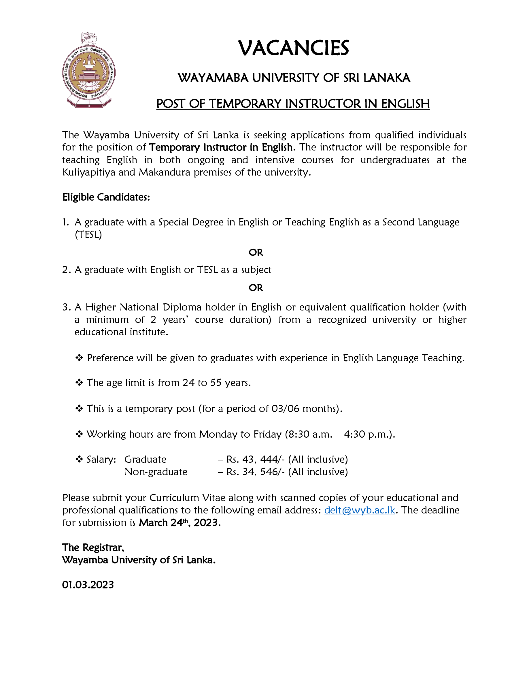Temporary Instructor - WUSL - www.gazette.lk