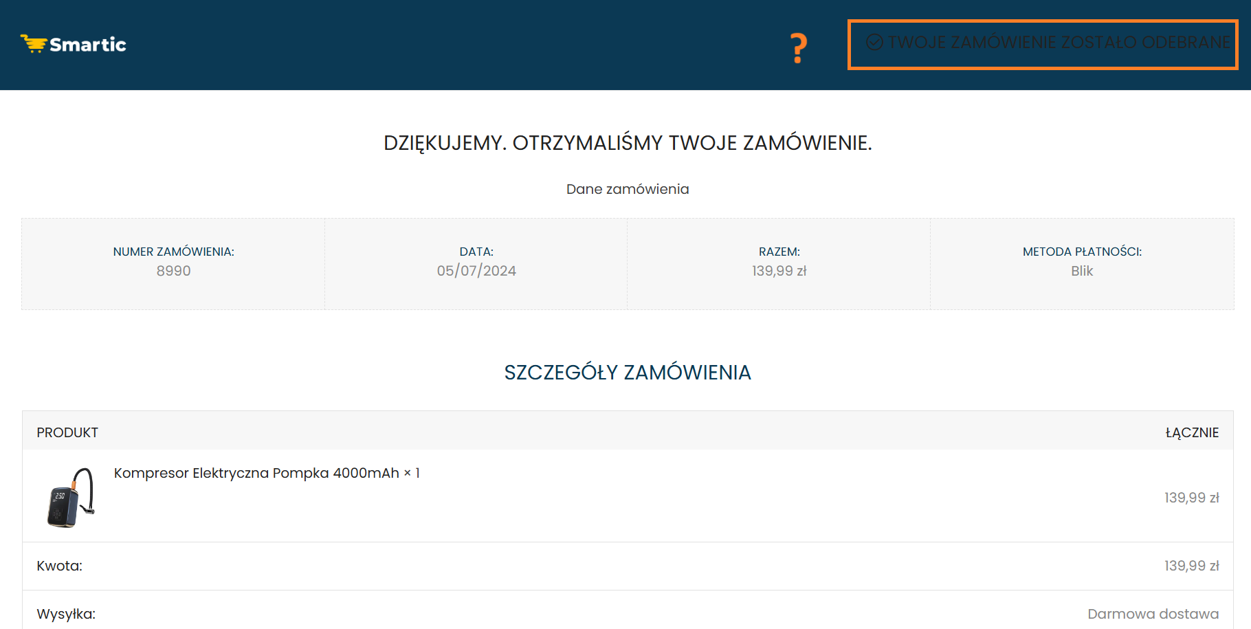 Twoje zamówienie zostało odebrane