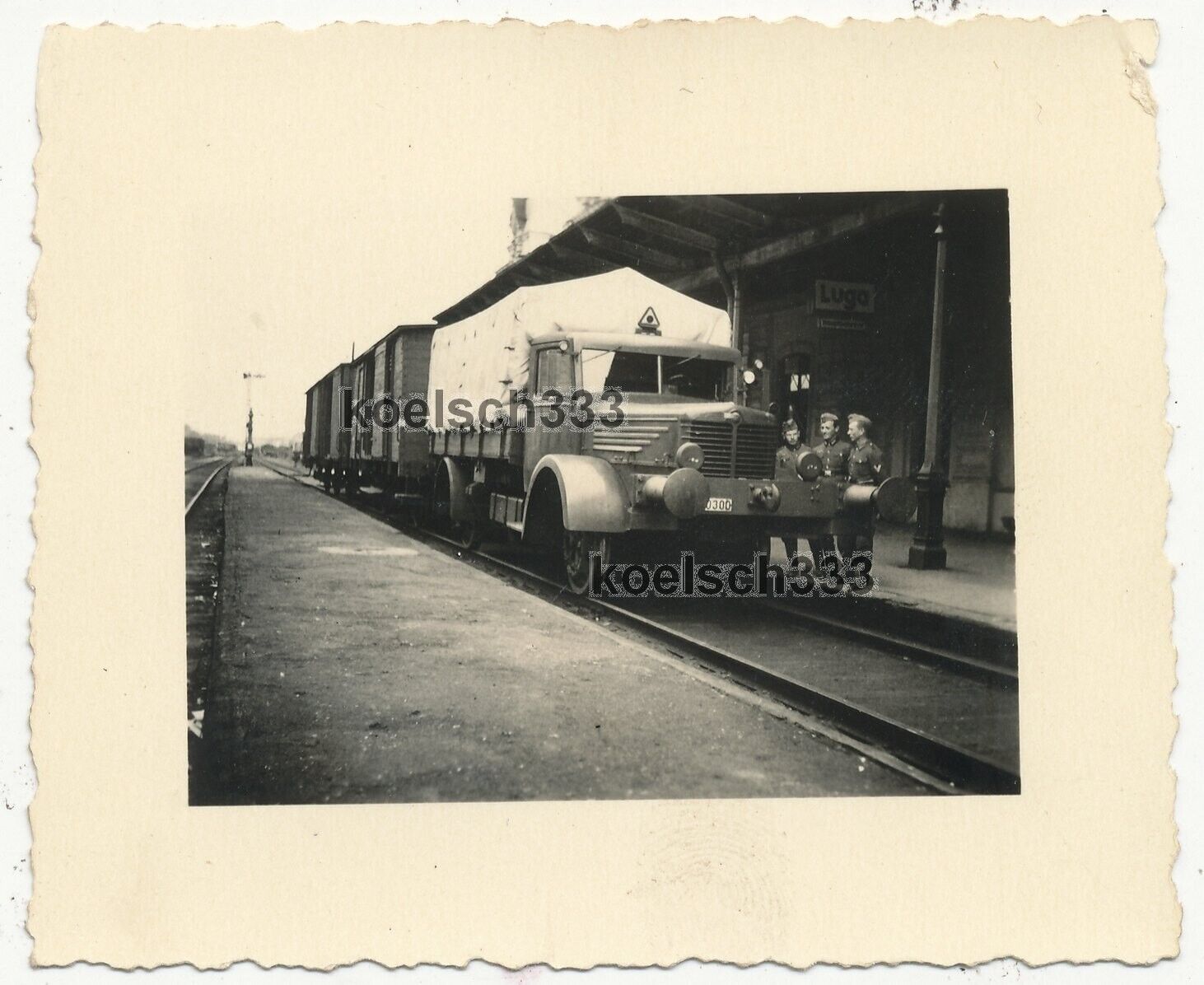 Foto Soldat der Wehrmacht am Büssing NAG Schienen LKW am Bahnhof Luga Russland