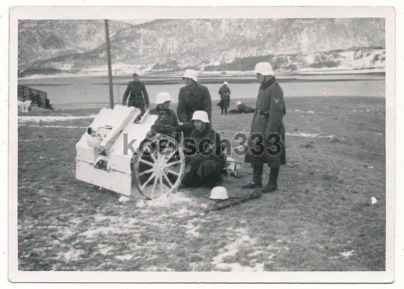 Foto Soldaten der Wehrmacht am Infanteriegeschütz IG 18 Stahlhelme Schneetarnung