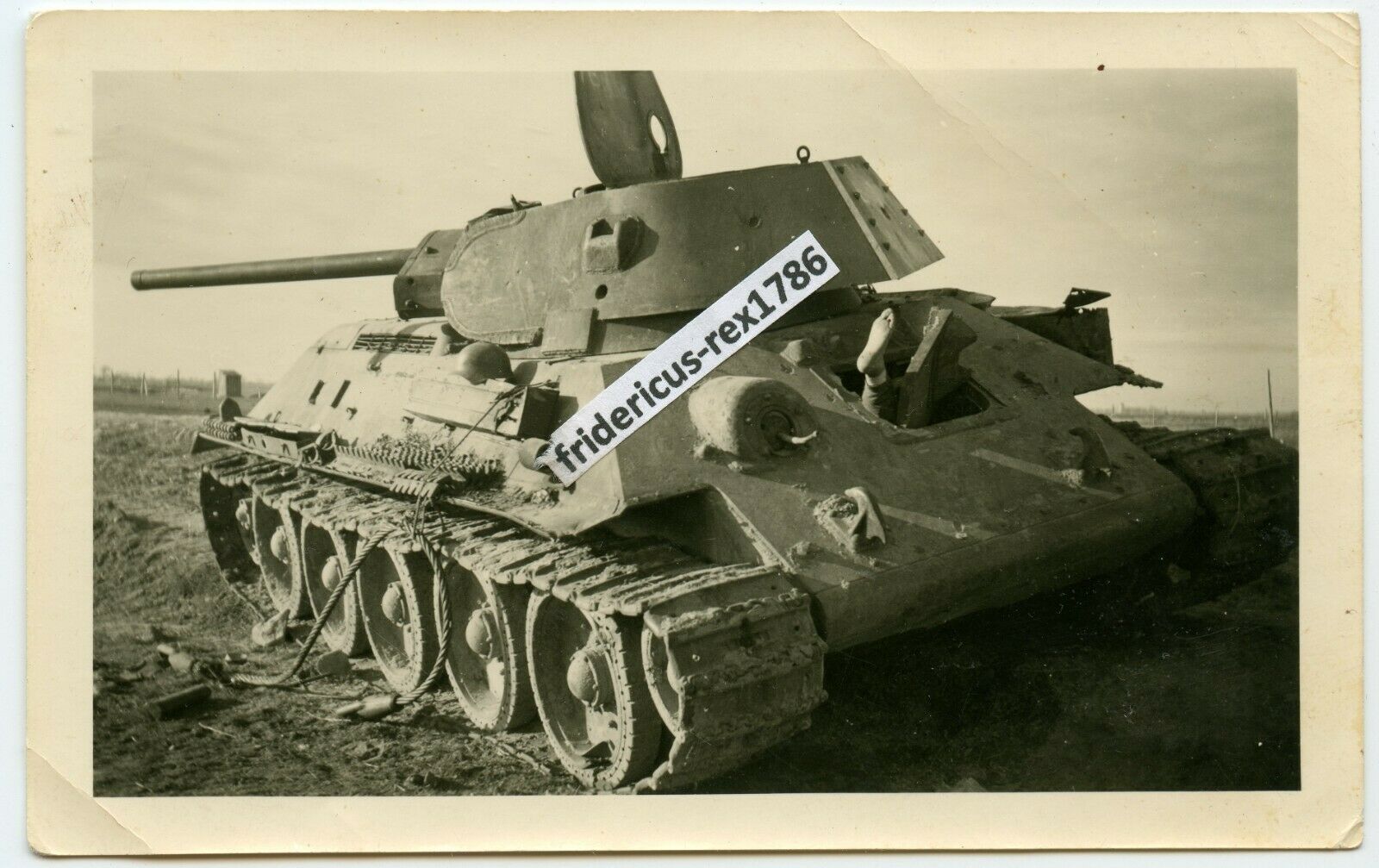 Foto 1 Ostfront sowjetischer Panzer T-34 nach Volltreffer Fahrerluke Füße