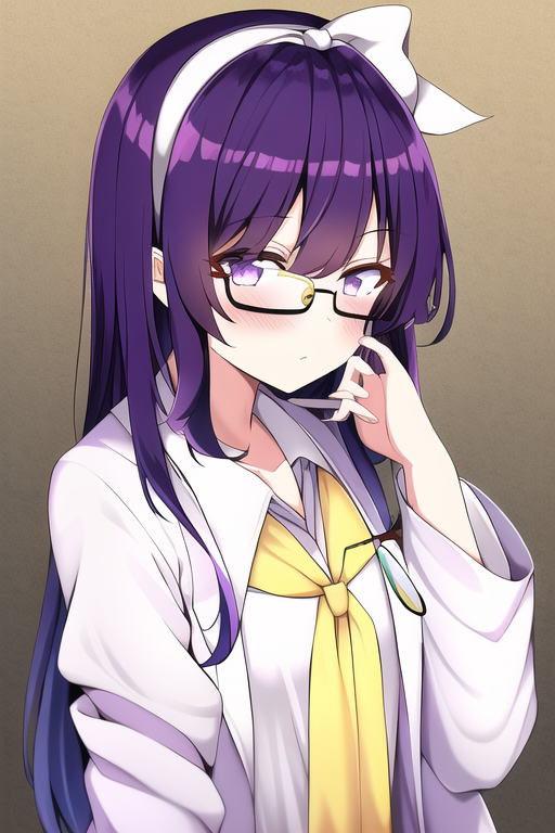 1girl, touhou, purple hair, purple eyes, long hair, hair, small breasts, labcoat, white shirt, ribbo