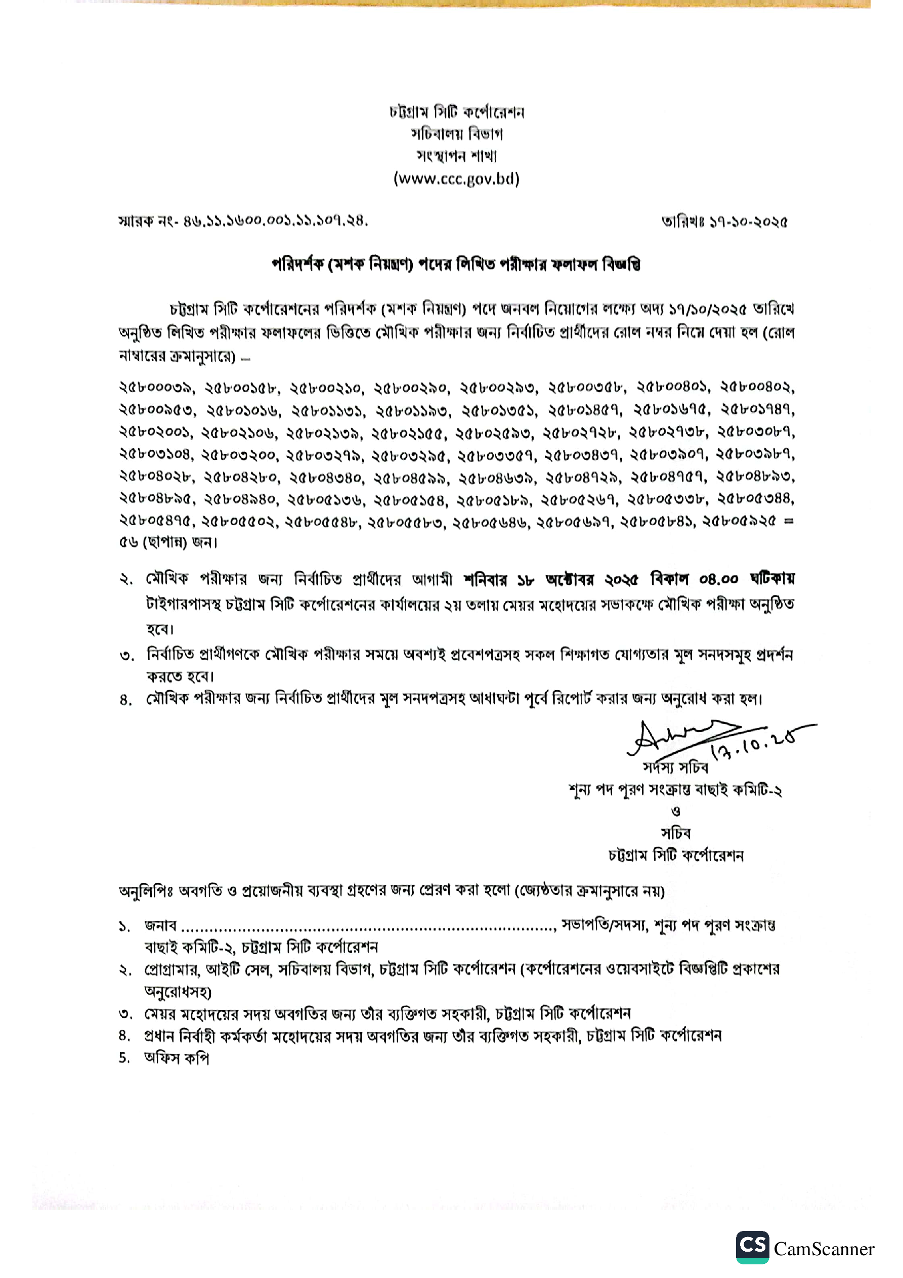 Chittagong City Corporation Inspector (Mosquito Control) Exam Result 2025 PDF