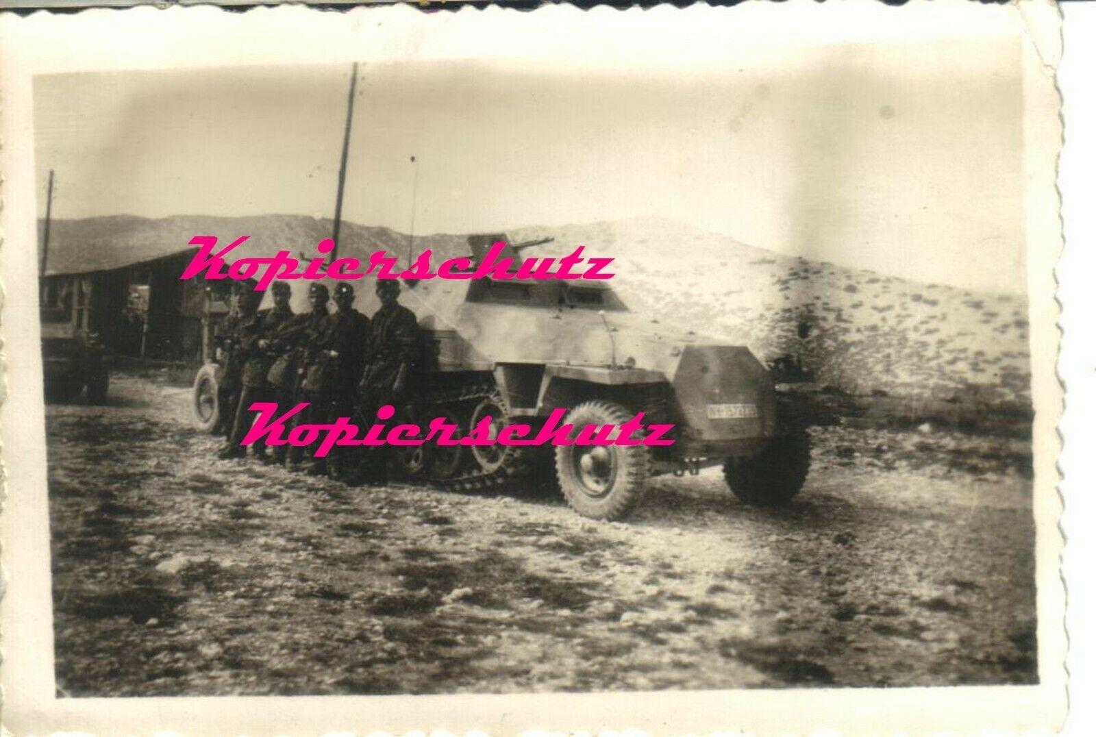 2. WK Foto deutscher Panzer Spähwagen Tarnuniform Palmenmuster Helmüberzug.