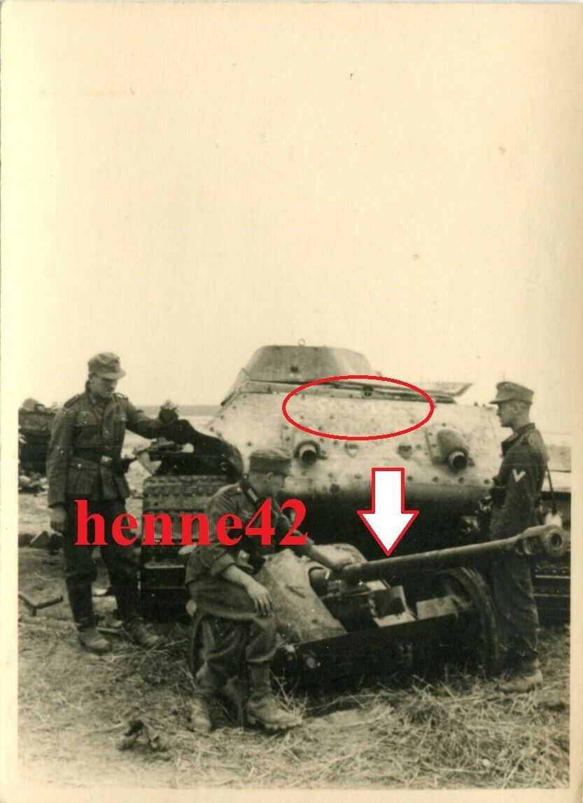 Foto Wehrmacht abgeschossener Panzer T34 überrollt Deutsche 5 cm Pak 38..