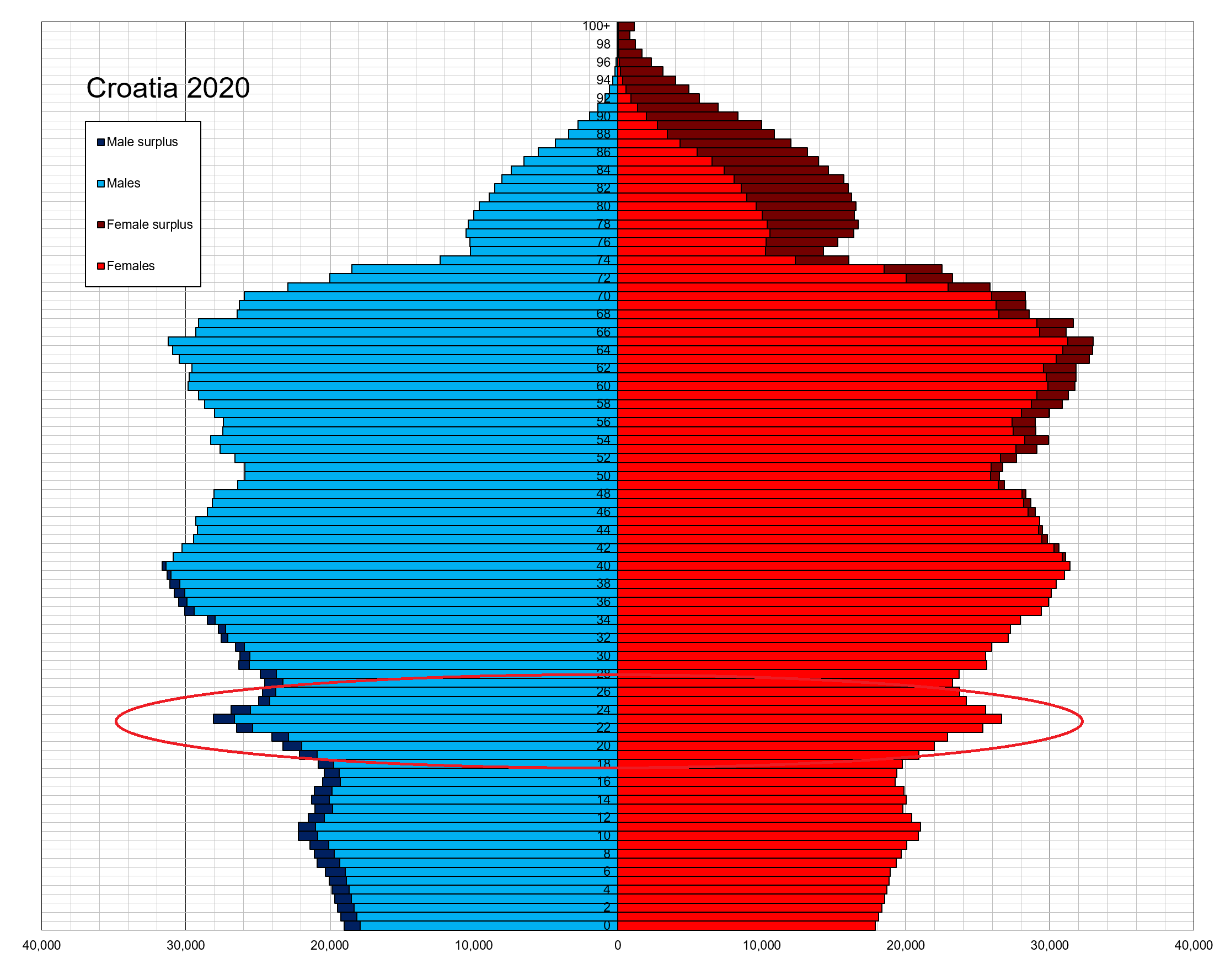 Croatia single age population pyramid 2020