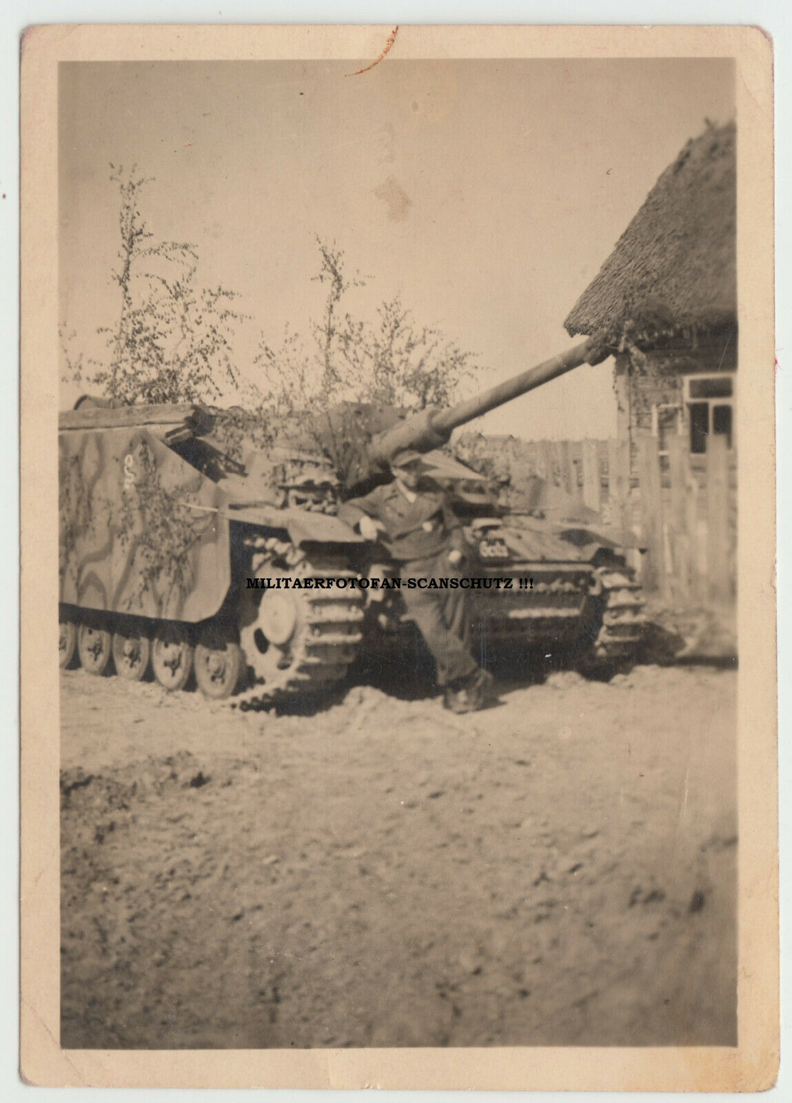 Orig.Foto Wehrmacht Sturmgeschütz III mit Kettenschutz russisches Dorf Rußland