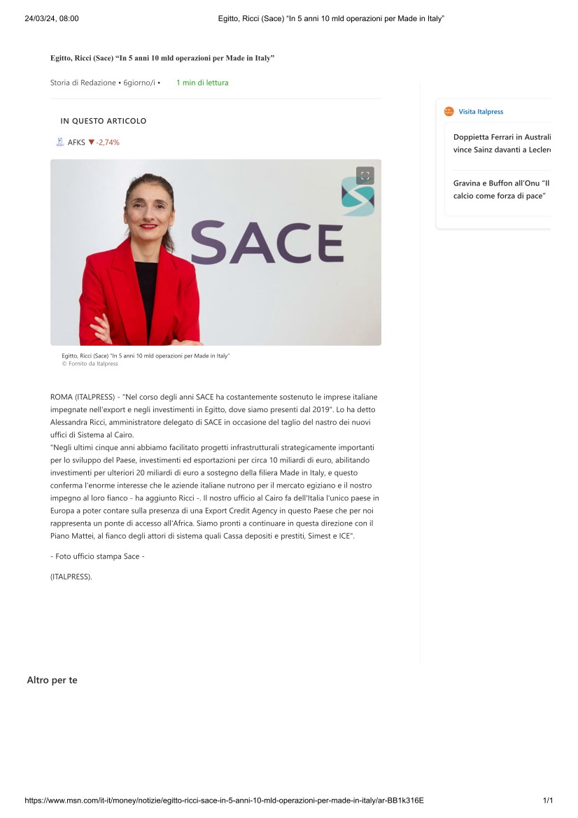 Egitto, Ricci (Sace) “In 5 anni 10 mld operazioni per Made in Italy”_01