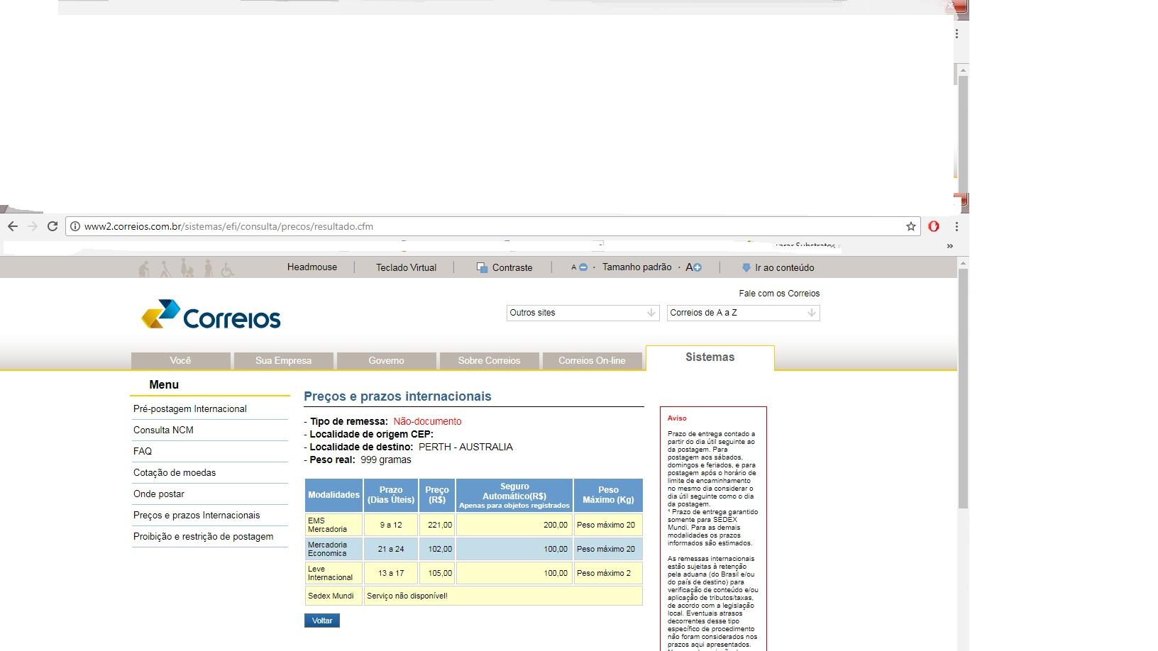 Preço Postagem Australia