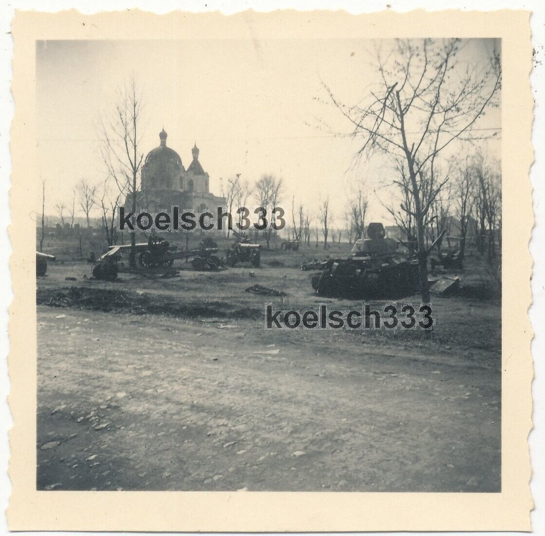 Foto russische Panzer und Artillerie Geschütz Wracks vor einer Kirche im Osten