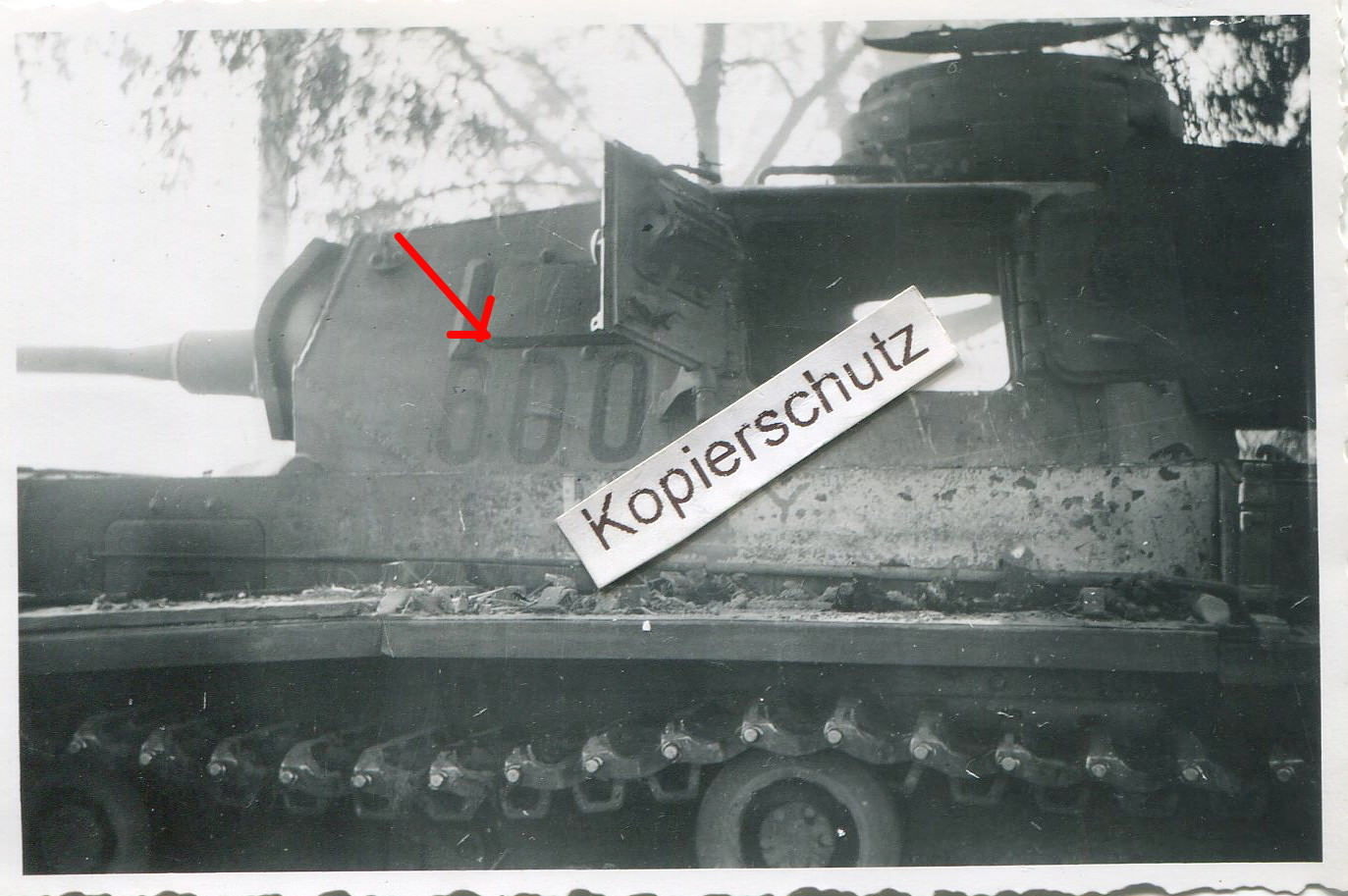 Panzer Rgt. 35 , zerstörter dt. Panzer mit Nummer 600 auf Turm