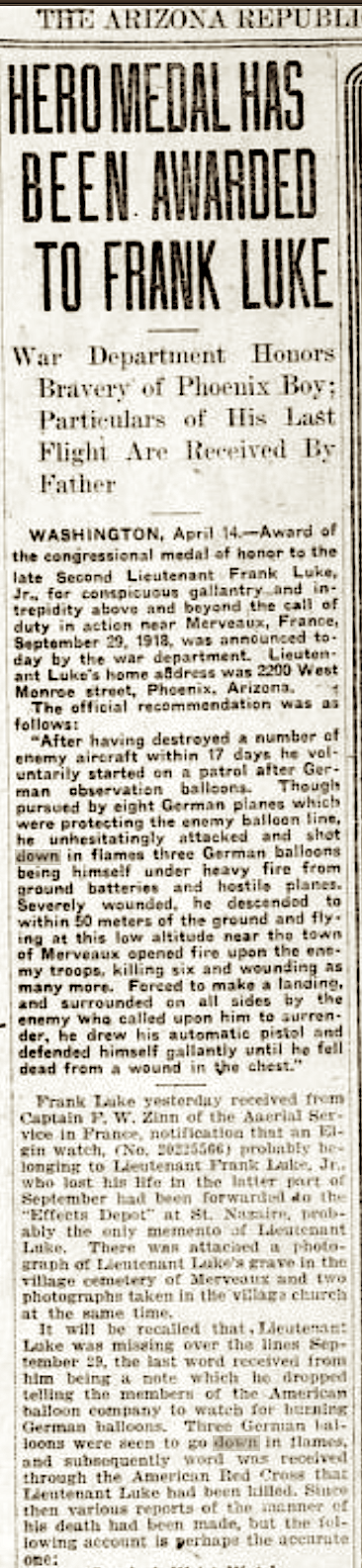 04-15-1919, Frank Luke Medal, Arizona Republican.1