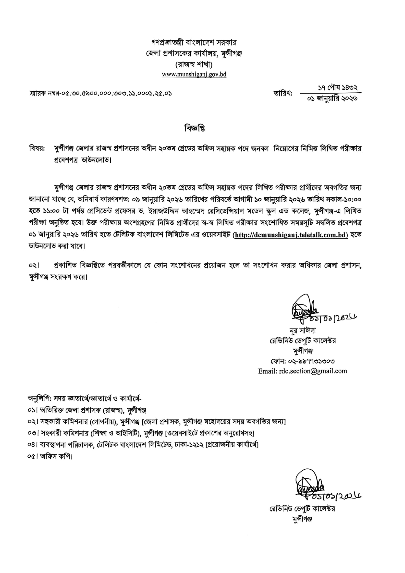 DC Office Munshiganj Revised Exam Date 2026 PDF 1