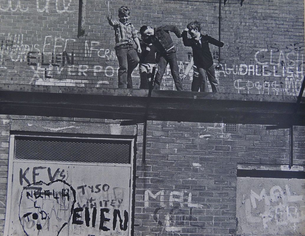 Five children playing on the Bootle Cinema roof, next to Malvern Road