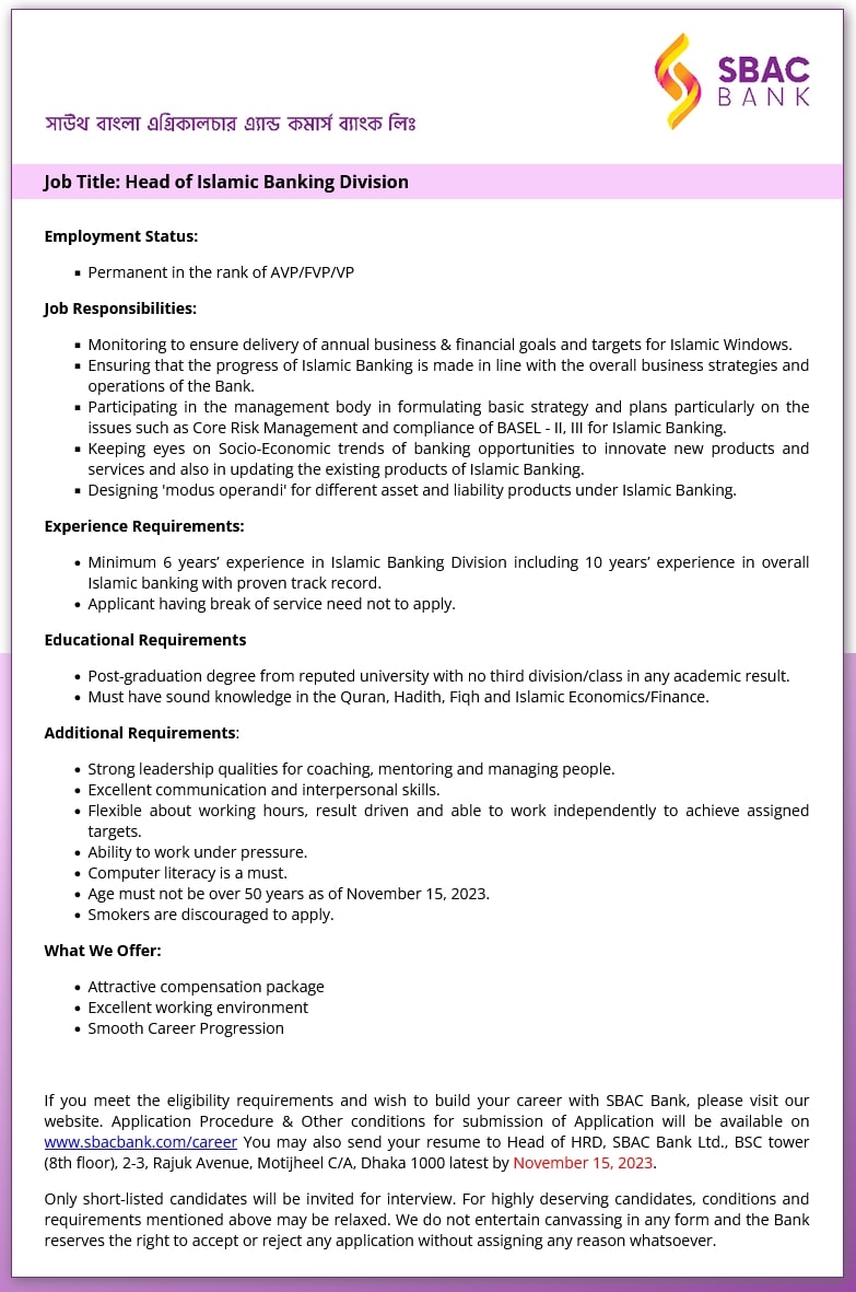 SBAC Bank Head of Islamic Banking Division Job Circular 2023