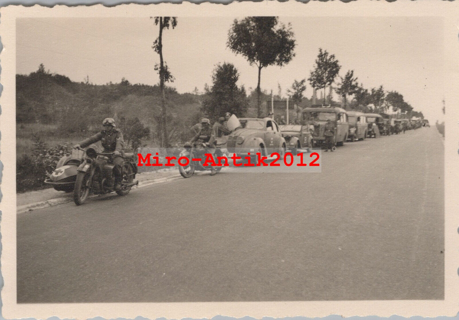 Foto, Wehrmacht, Sanitäts Konvoi mit Krad Gespann, Pkw und Lkw, France