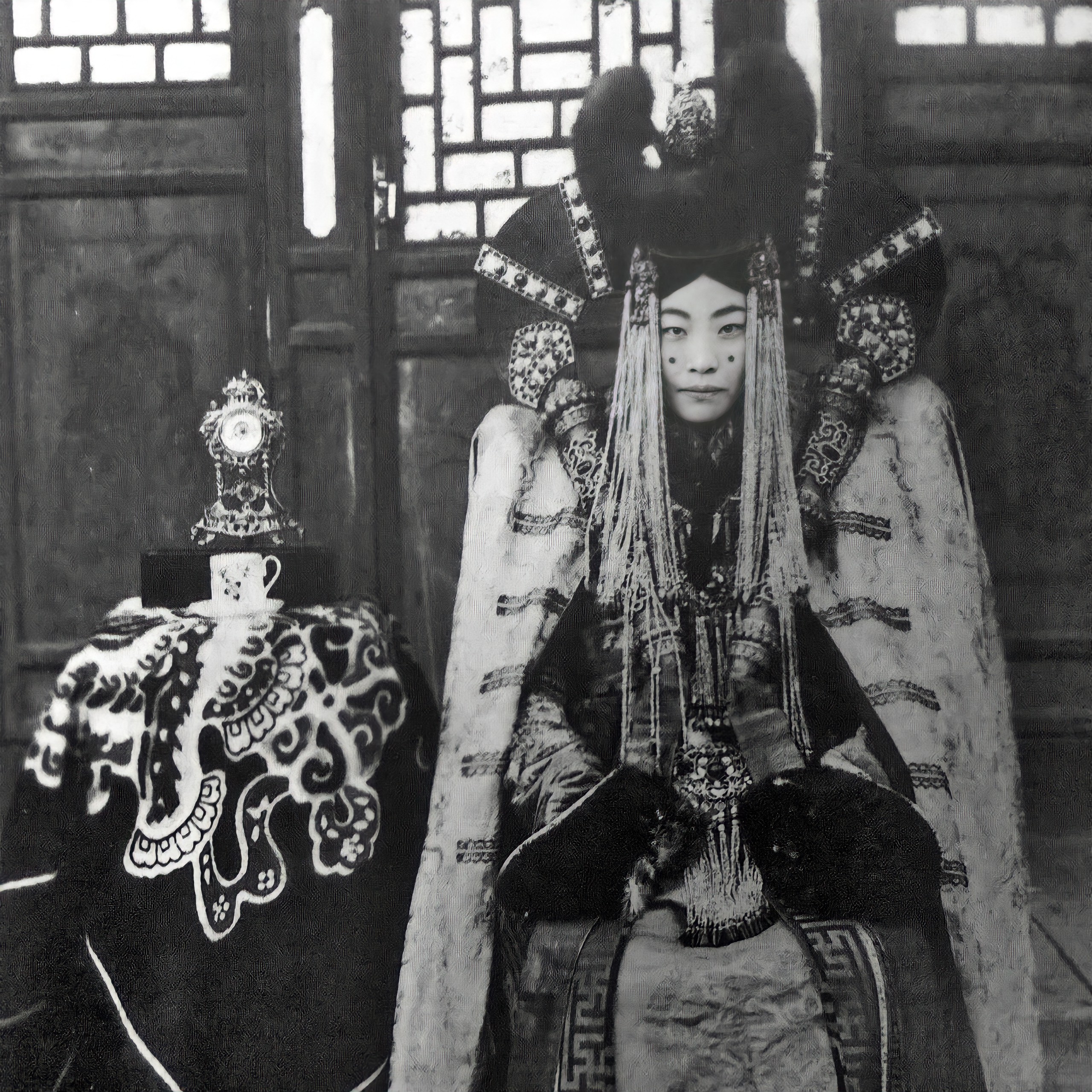 A Mongolian lady sits for her portrait before a Chinese photographer