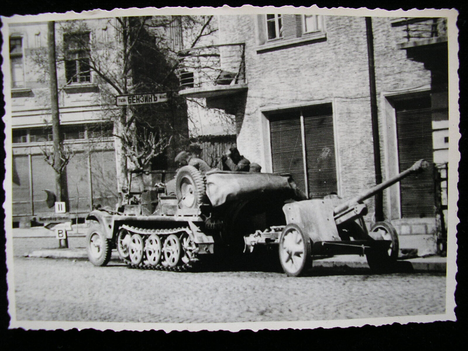 Foto Sdkfz Halbkette 7,5Pak vor russ. Tankstelle