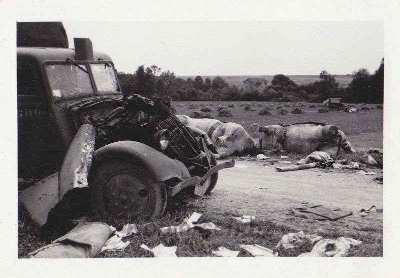 verendete Pferde am zerstörten französischen LKW
