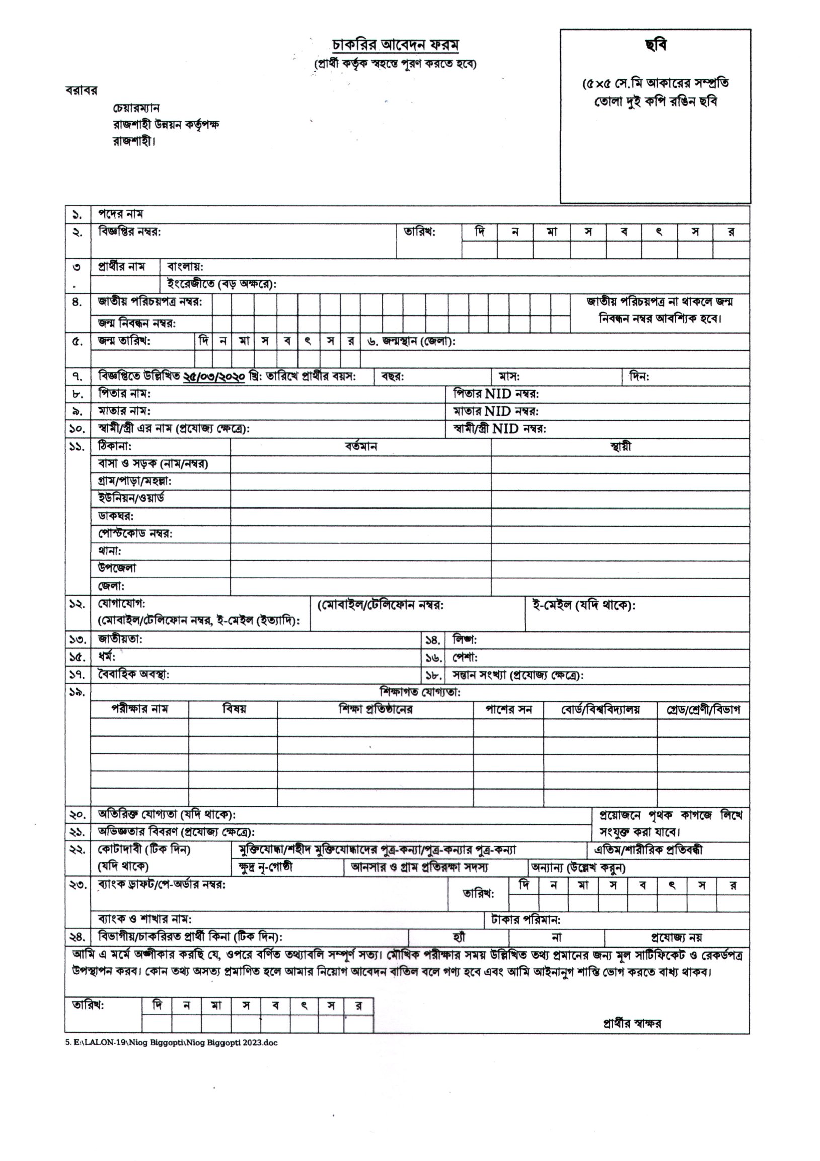 Rajshahi Development Authority (RDA) Job Application Form 2023 PDF