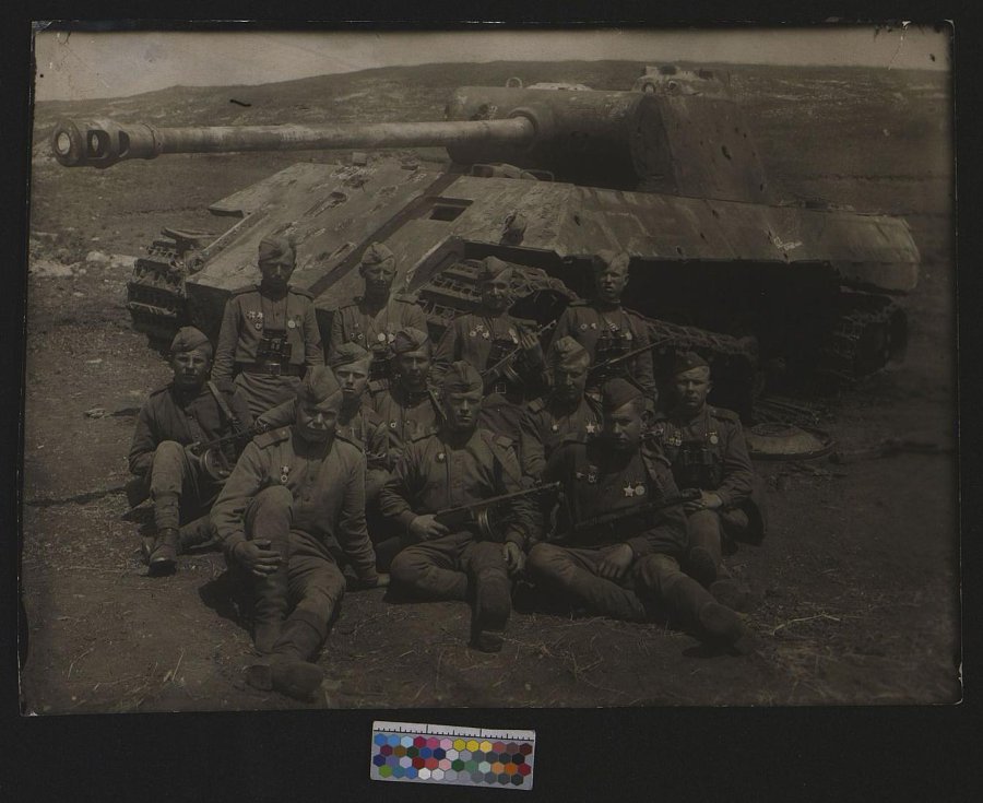 Лучшие артиллеристы - истребители танков у подбитого немецкого танка во время практических занятий 3