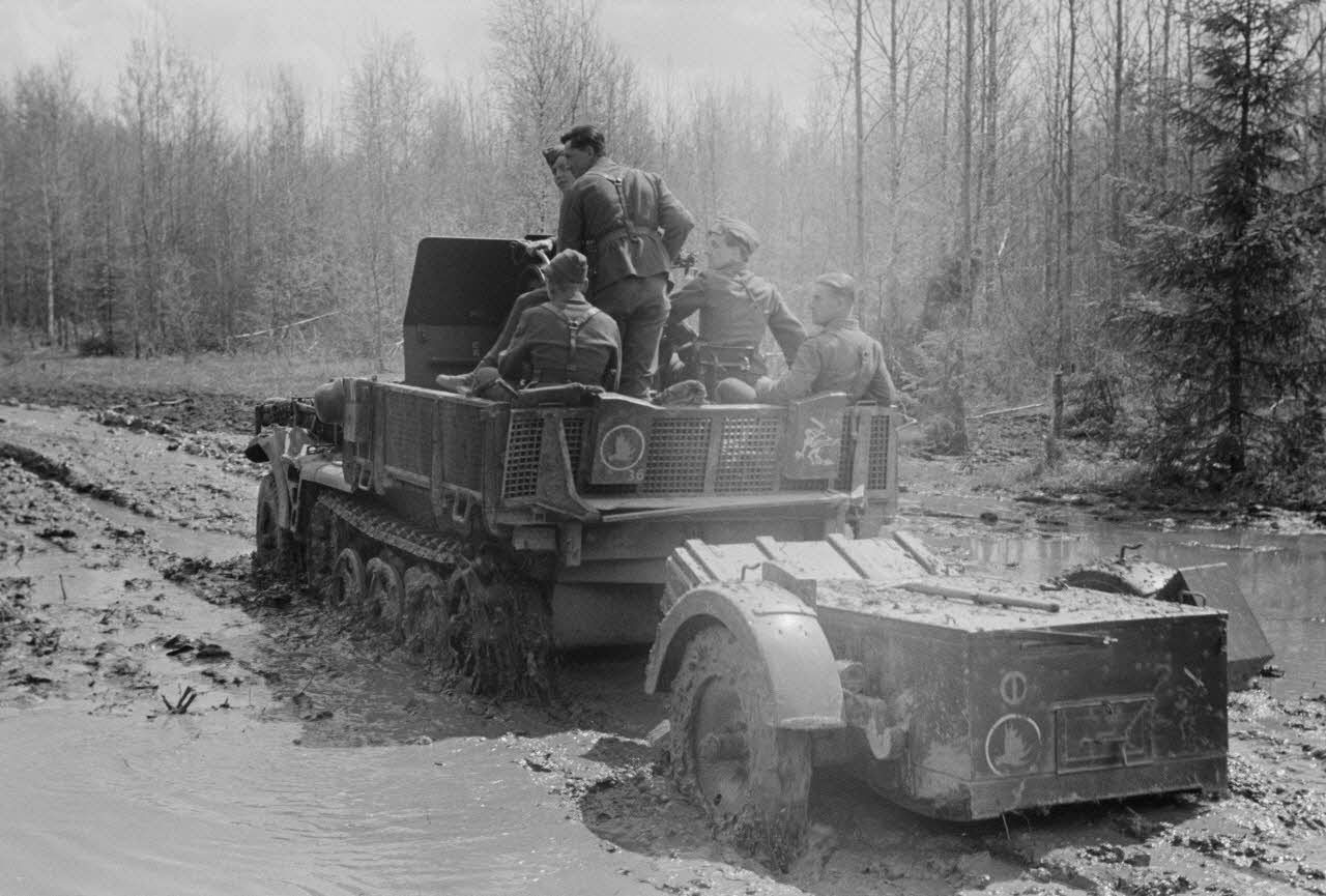 Un semi-chenillé Sd.kfz.7-1 armé de 2 cm FlaKvierling 38 et son équipage du Leichte Flak Abteilung 7