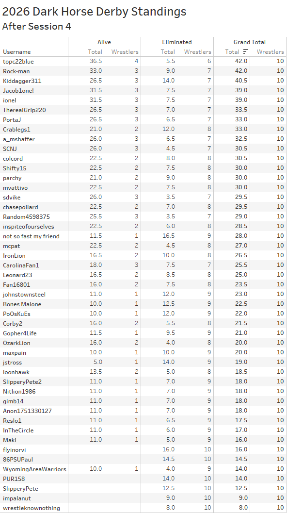2026 Dark Horse Derby Standings session 4