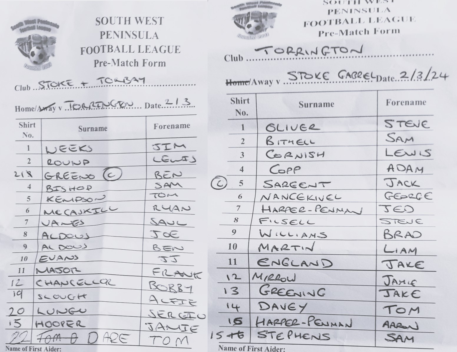 team sheet