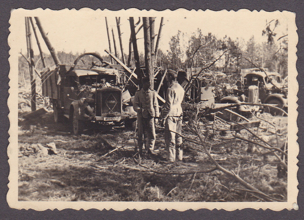 Foto 2.WK.Kameraden vor zerstörte LKWS-WH-697115