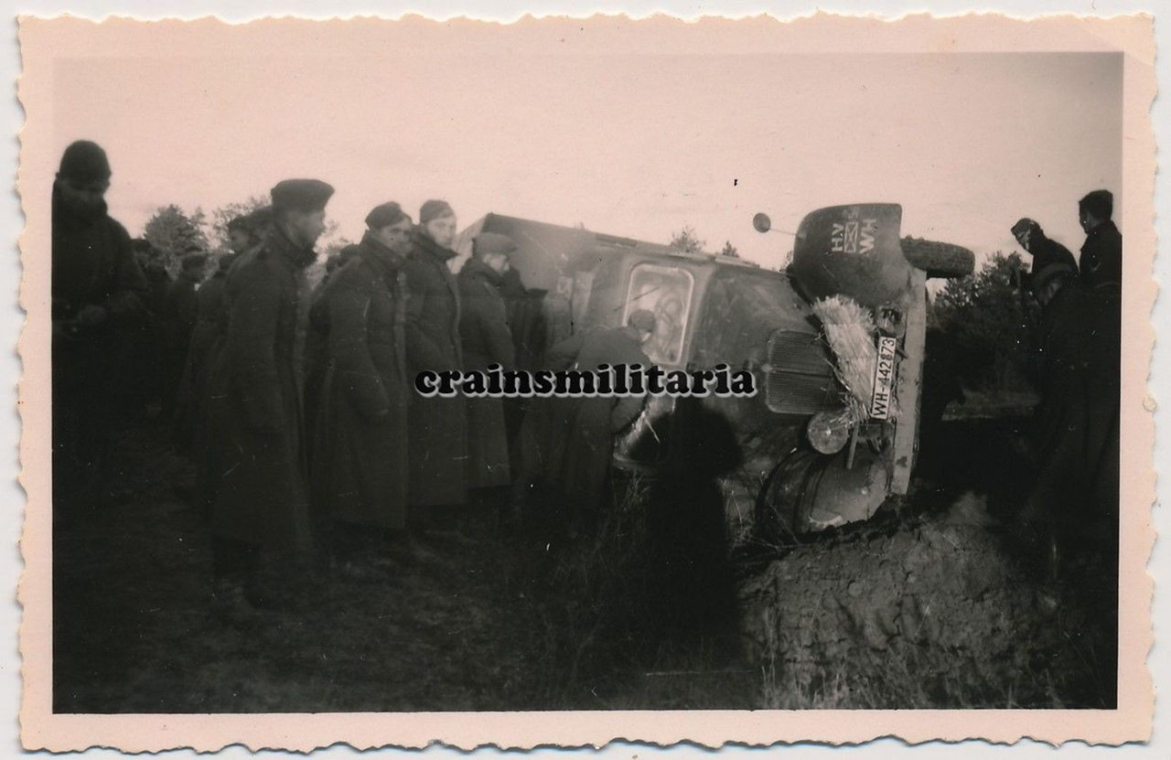Солдаты Вермахта у слетевшего с дороги трофейного грузовика Renault AGC-3