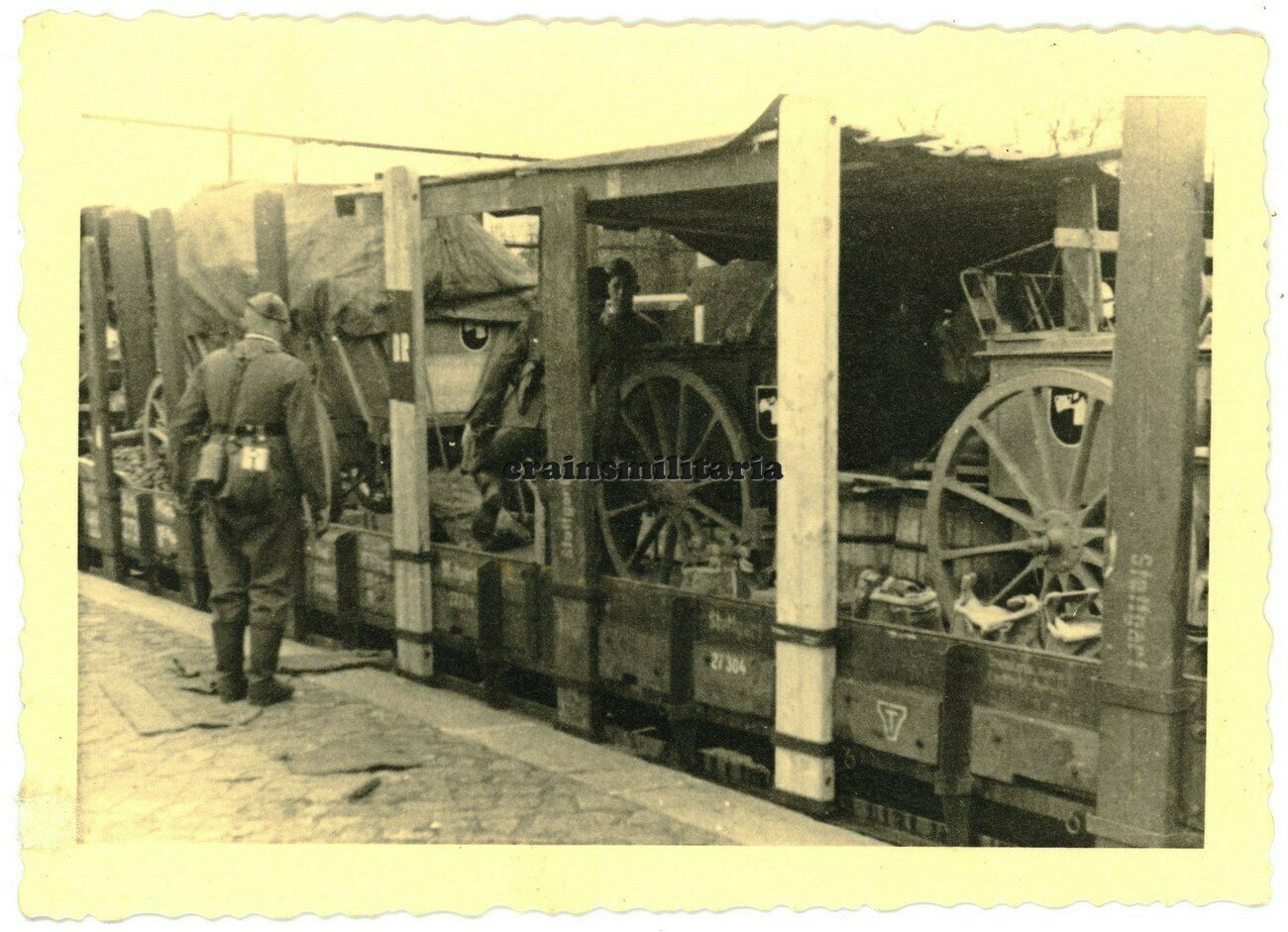 Orig. Foto Feldküche Gulashkanone Wagen mit Wappen Hund am Bahnhof Zug