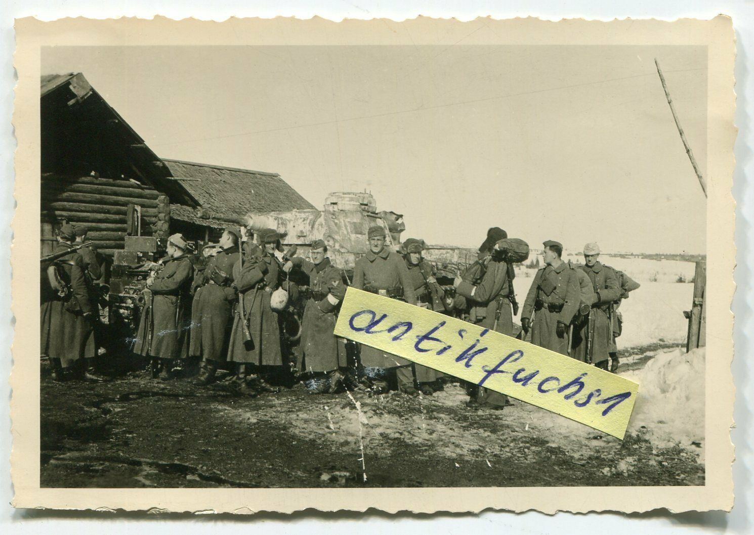 Deut.Panzer mit Winter-Tarnanstrich im Dorf in Rußland an der Os