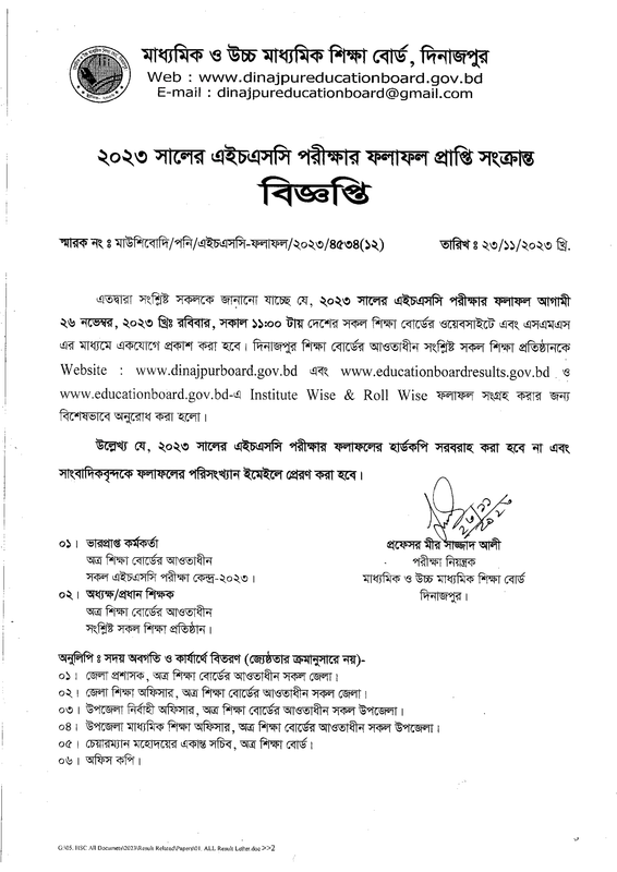 Dinajpur Board HSC Result Notice 2023 PDF