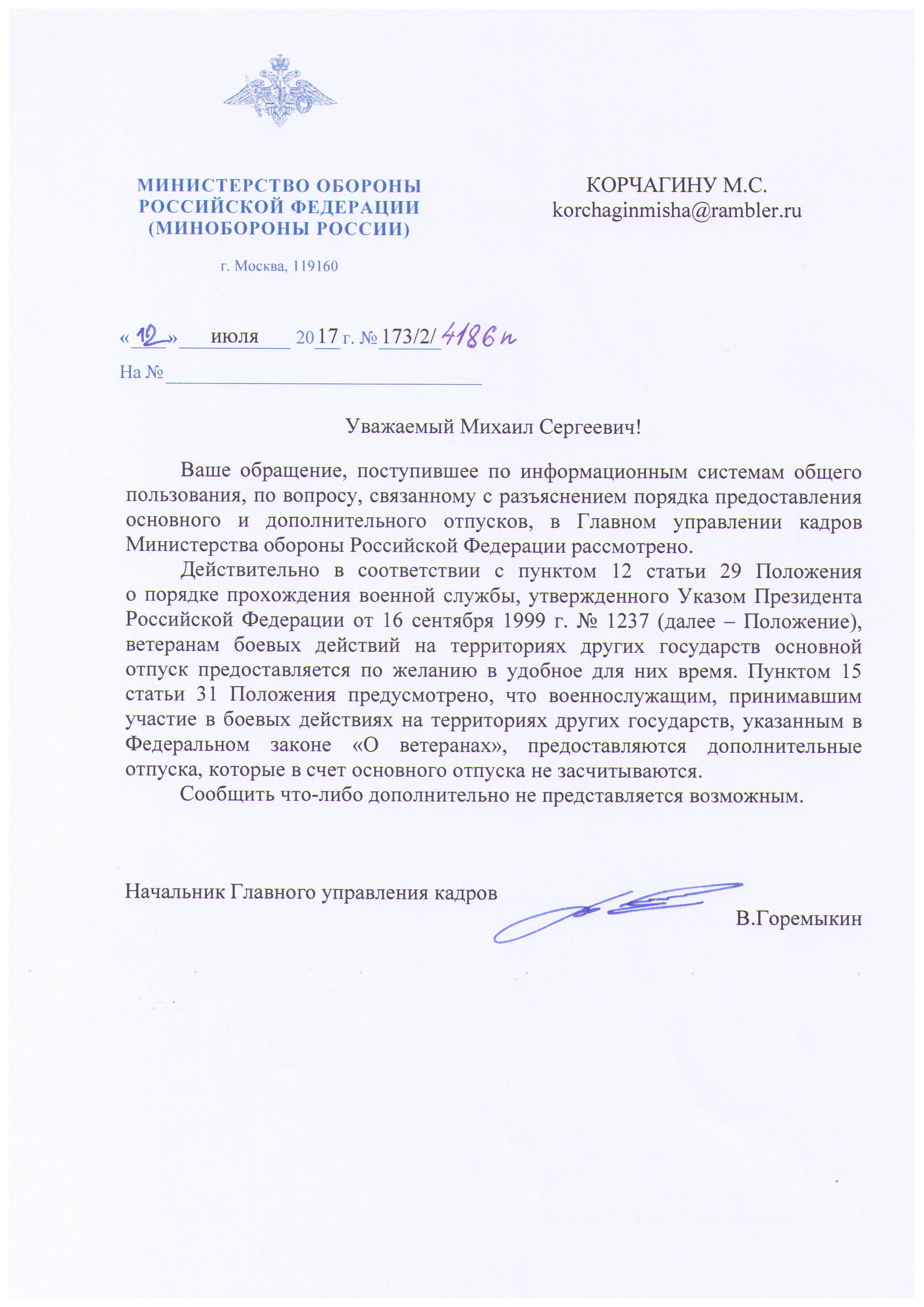 доп отпуск ВБД ответ МО ?Ф