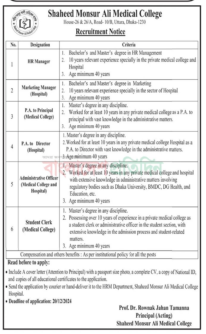 Shaheed Monsur Ali Medical College (SMAMC) Job Circular 2024