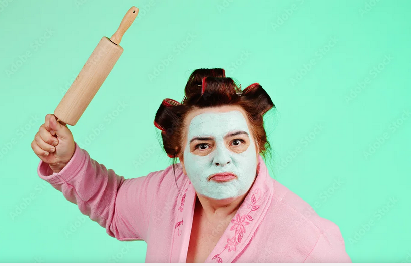 Photo femme avec bigoudis fâchée avec rouleau à pâtisserie