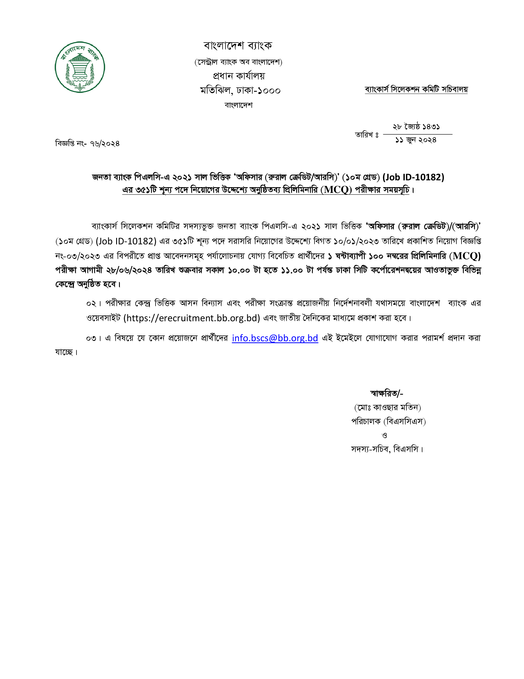 Janata Bank Officer (RC) MCQ Exam Date 2024 PDF