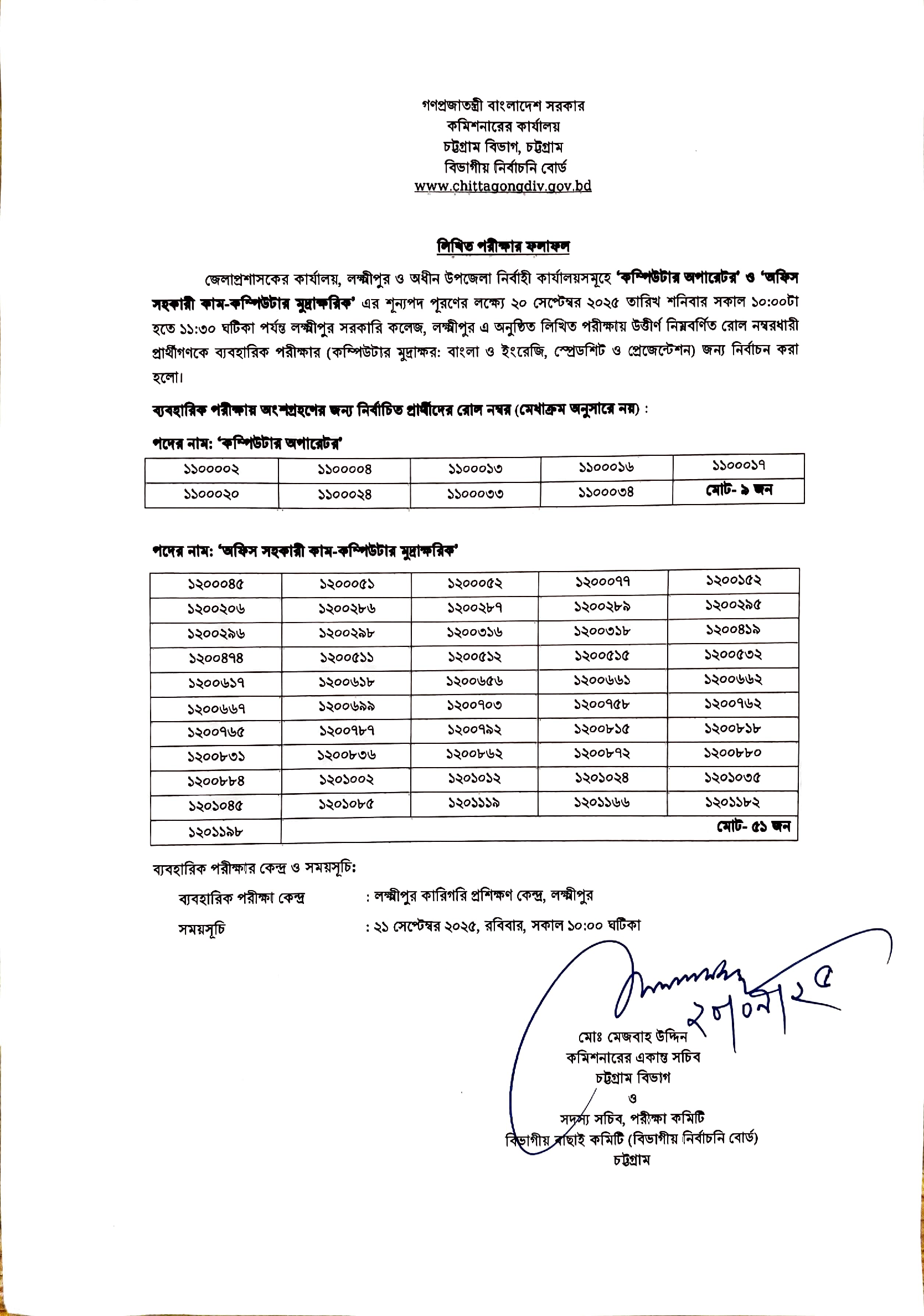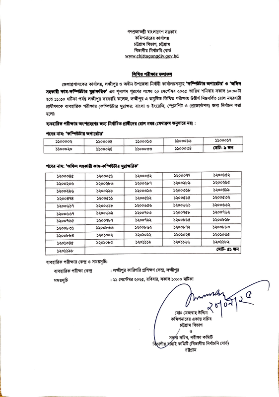 DC Office Lakshmipur Exam Result 2025 PDF