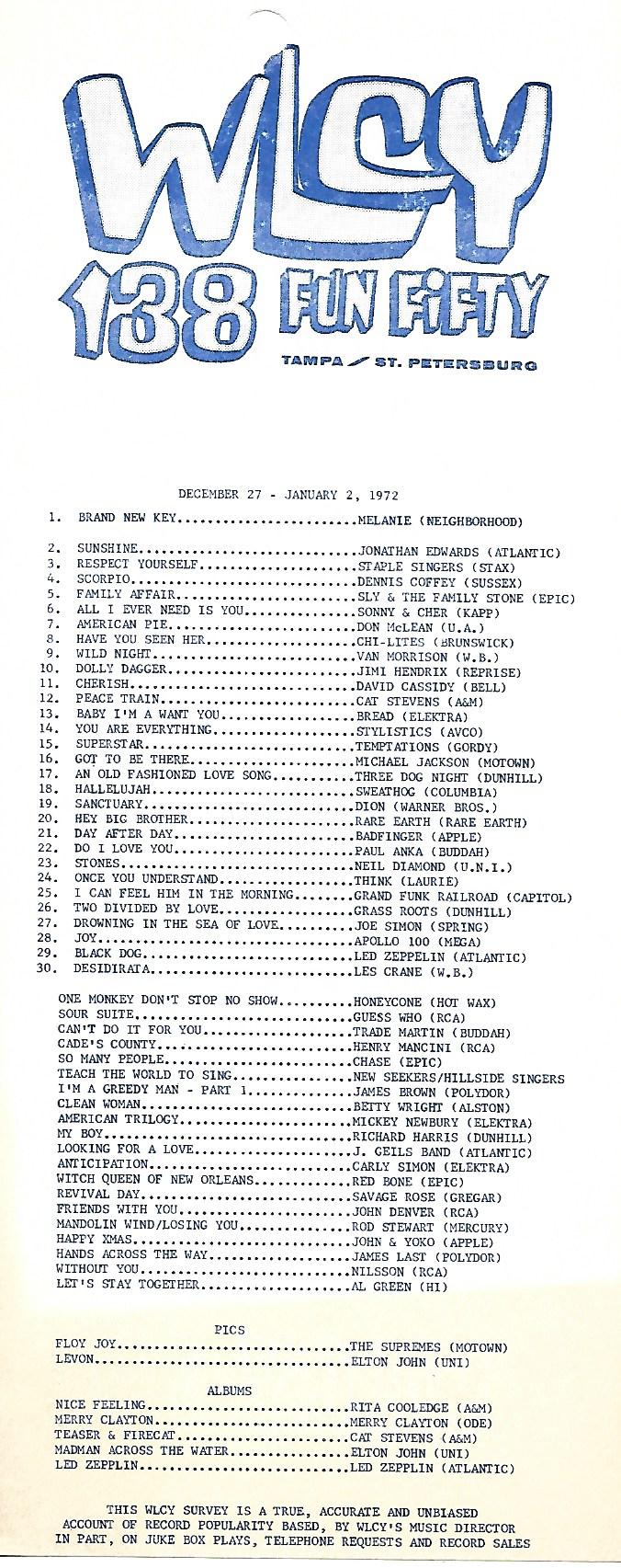 WLCY Tampa Chart Jan 2 1972