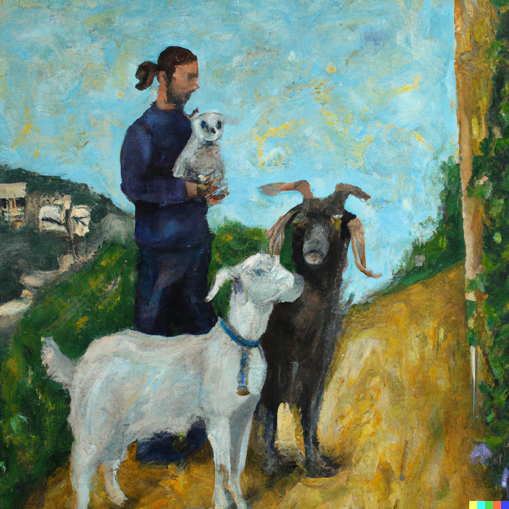 DALL·E 2022-12-24 00.09.19 - An oil painting of a goat, a man and a dog