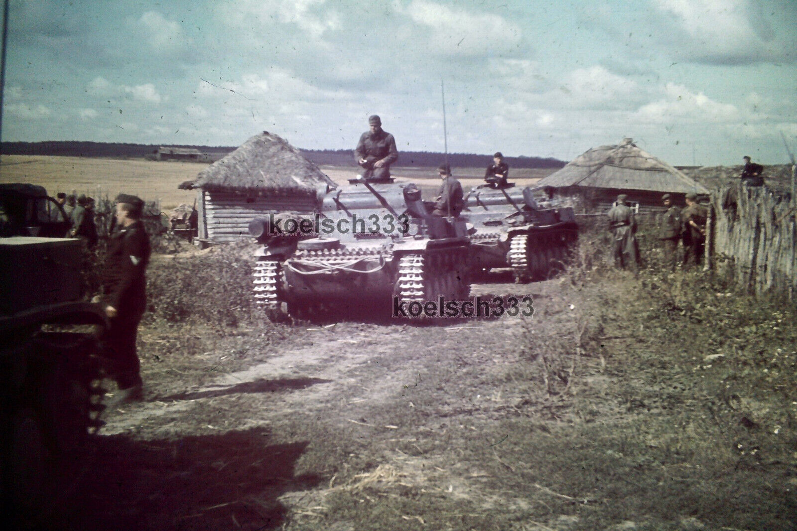 Foto Agfacolor Farb dia Panzer vor Bauernhäusern an der Ostfront 7. Pz. Div.